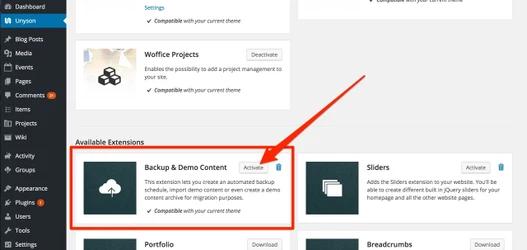 Go to Unyson (Woffice’s Extensions) page and activate the “Backup & Demo Content” extension if not yet activated: