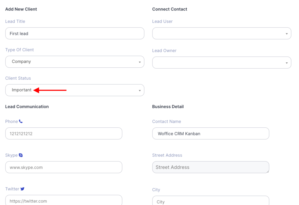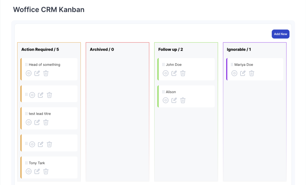 5. To add a new lead and assign a status to it, click on the “Add New” button on the page and proceed with assigning a status to the lead. Below is a sample screenshot: