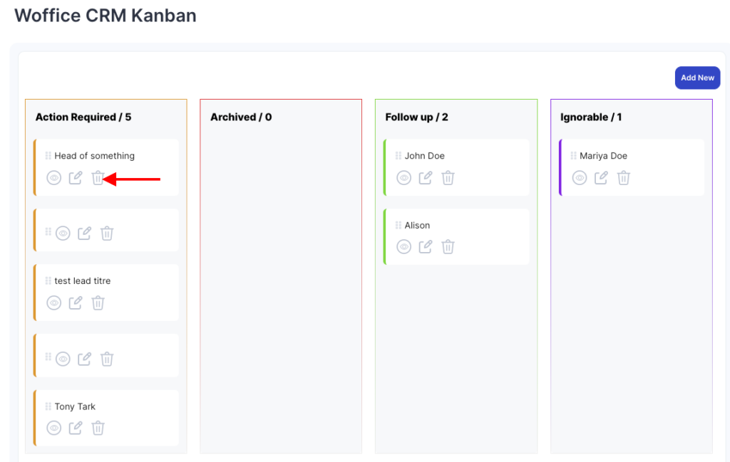 Deletion of leads is also possible from the front-end. This can be achieved by clicking on the delete icon next to the lead as illustrated below: