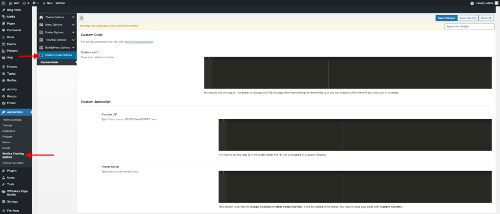 The “Custom Code” option is located within the Appearance > Woffice Theming Options > Custom Code Options.