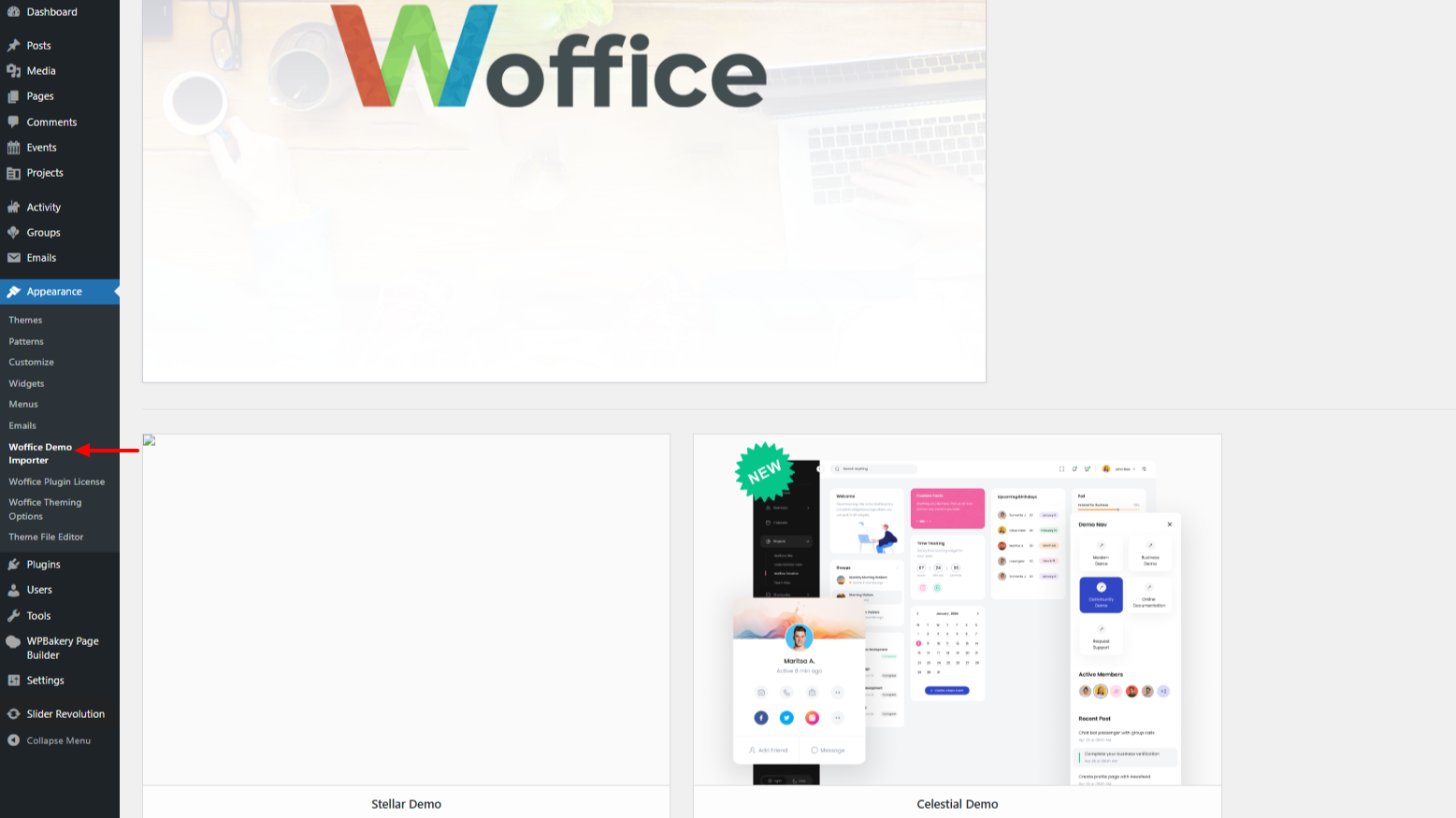 Navigate to the Appearance > Woffice Demo Importer section: