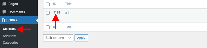 In the Shortcode, you will need to alter the okrs_id value and replace it with your OKR ID. You can find your OKR ID by accessing the OKRs section within your WordPress dashboard and within the ID section, you will find the OKR ID.
