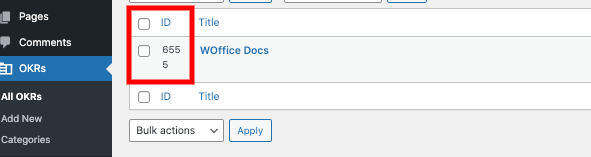 Single OKRs can be displayed on a page by adding the shortcode :: [woffice_okr id=”okb_id”] to the page.