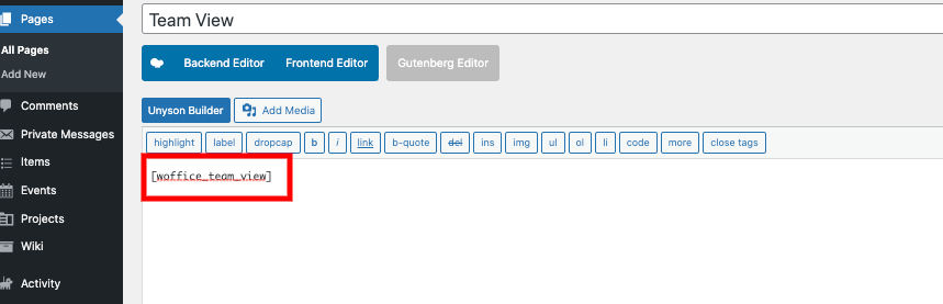 - Add the [woffice_team_view] Shortcode to the page and save your changes
