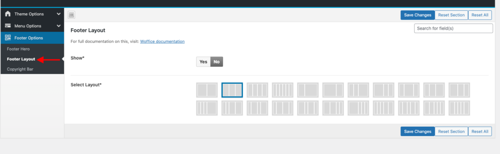 This option is present within the Appearance > WOffice Theming Options > Footer Options > Footer Layout section.