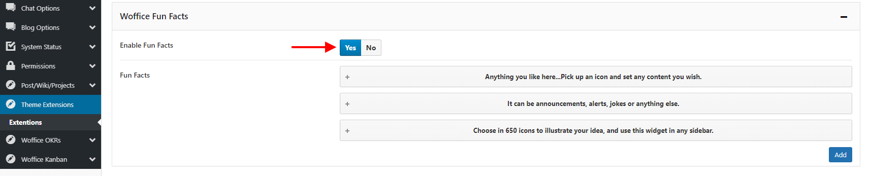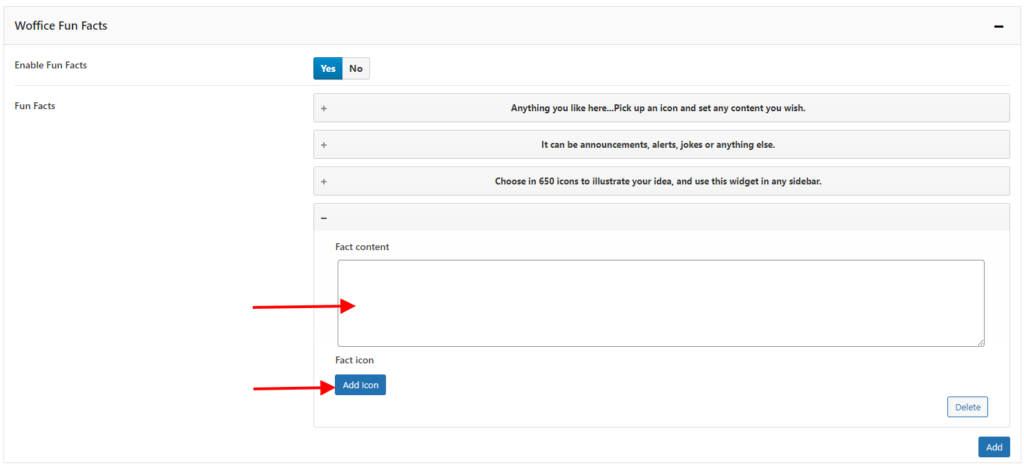 You can add your Fun Facts contents by clicking on the “Add” button as well as set your Fun Fact icon