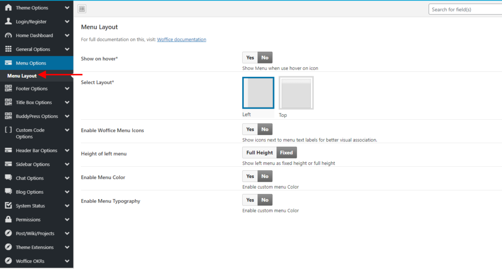 i) Navigate to the Appearance > Woffice Theming Options> Menu Options > Menu Layout.
