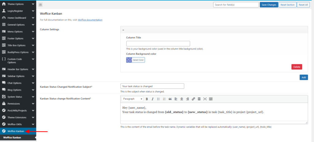 Navigate to the Appearance > Woffice Theming Options > WOffice Kanban section:
