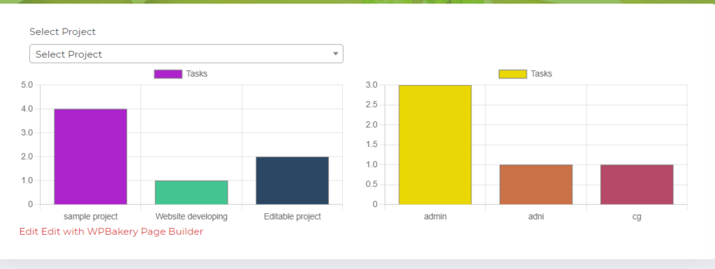 Here we have a view of two charts. The first chart displays the projects list, alongside the task count, whereas the second chart will show the user alongside the number of tasks assigned.