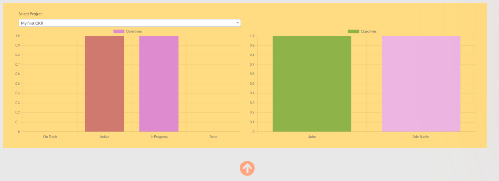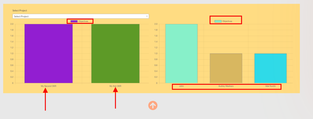 You will then have a chart with your OKRs rendered. The report will render a graph of OKRs against the objectives and Objectives against the users assigned the objectives as seen below: