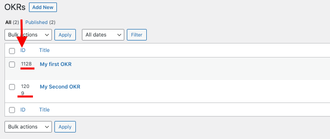 You will need to replace okr_id in the Shortcode with your OKR Id. You can find your OKR Id within the ID tab on the OKRs section within your WordPress dashboard.
