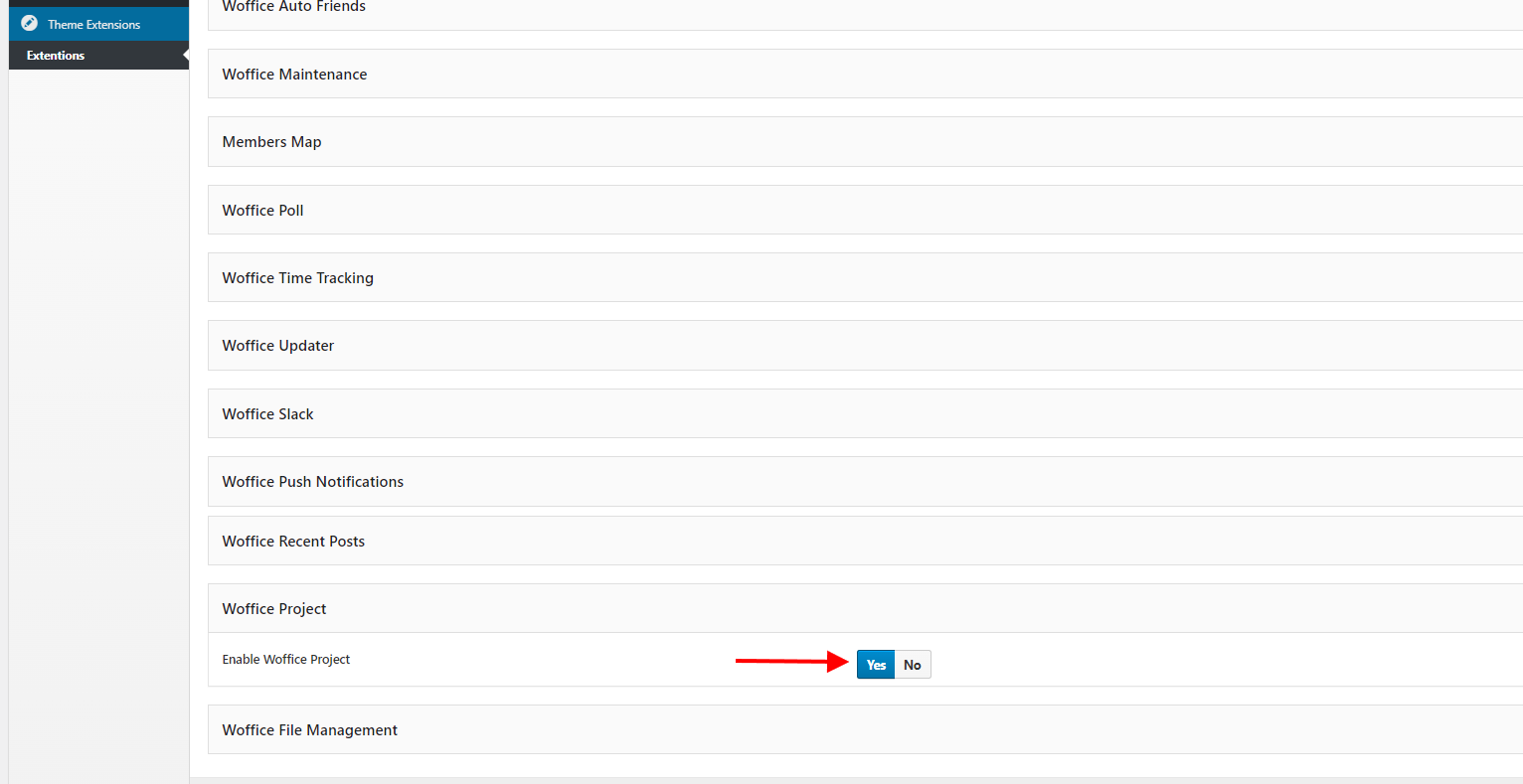 3. Navigate to the Appearance > Woffice Theming Options > Theme Extensions > Woffice Project and Enable Woffice Project