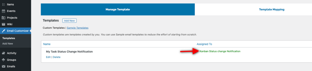 (i) Navigate to the Template Mapping section and click on “Kanban Status change Notification”