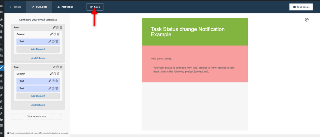 3. Within the next screen, you will be presented with the builder. The first row references the default green region “Task Status change Notification”. The second row contain the email body content. Below is a screenshot on this: