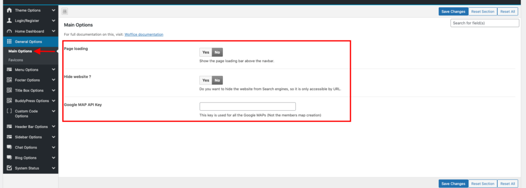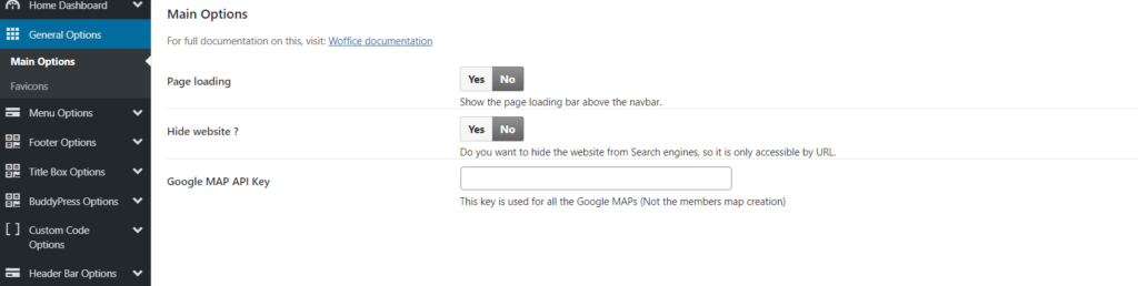 The Main General options are present within the Appearance -> Woffice Theming Options -> General options -> Main options section.