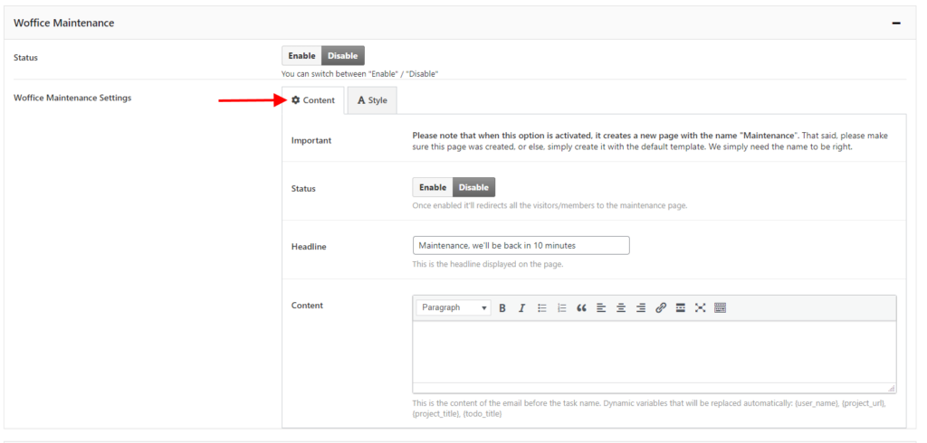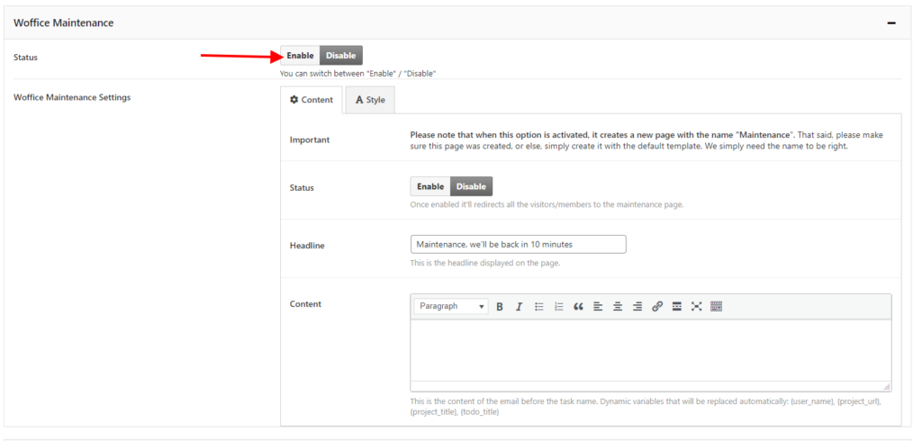 First, you’ll need to activate it from the Appearance > Woffice Theming Options > Theme Extensions > Woffice Maintenance section: