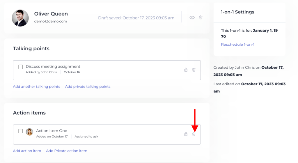 Action items can be deleted by clicking on the trash icon next to the action item.