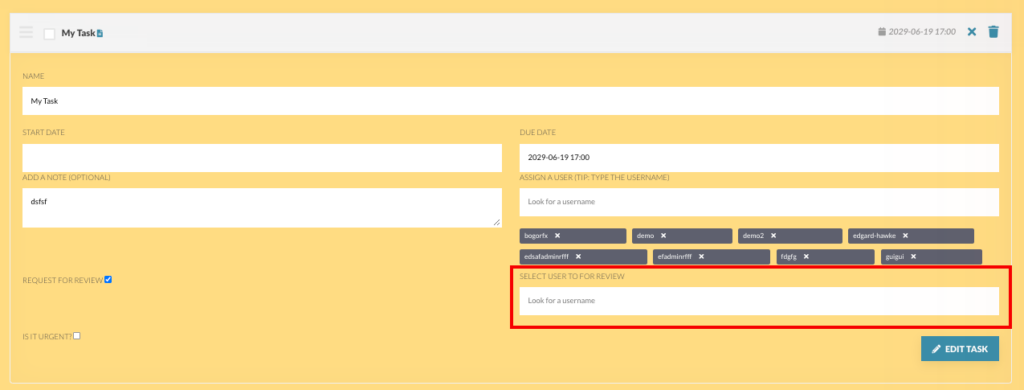 4. To the right, you will then be presented with an option to select the user to assign for review of the task.