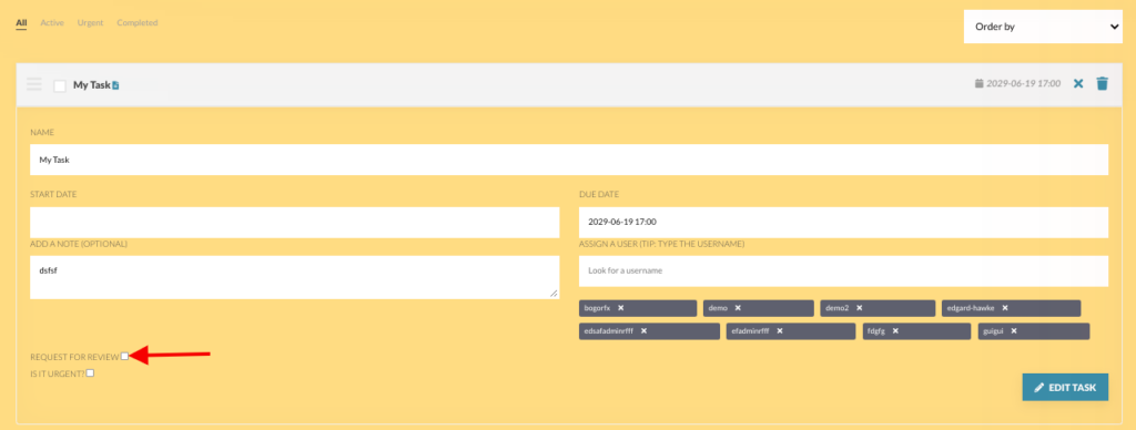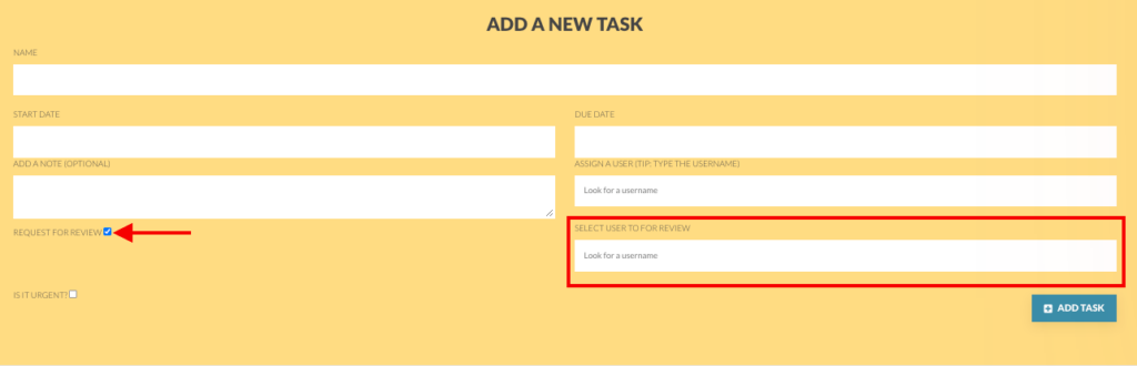 On the other hand, If no task is available within the project, users will need to first create a new task, enable the option “REQUEST FOR REVIEW” and select a user to review the task.