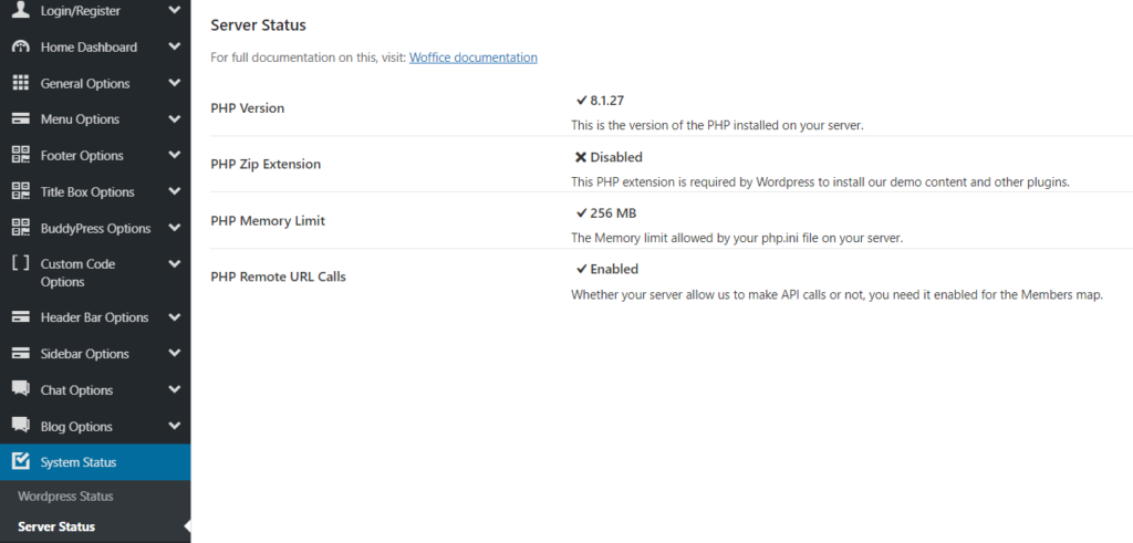 In order to now view your WordPress System Status you will need to navigate to the Appearance -> Woffice Theming Options -> System Status -> Server Status section.