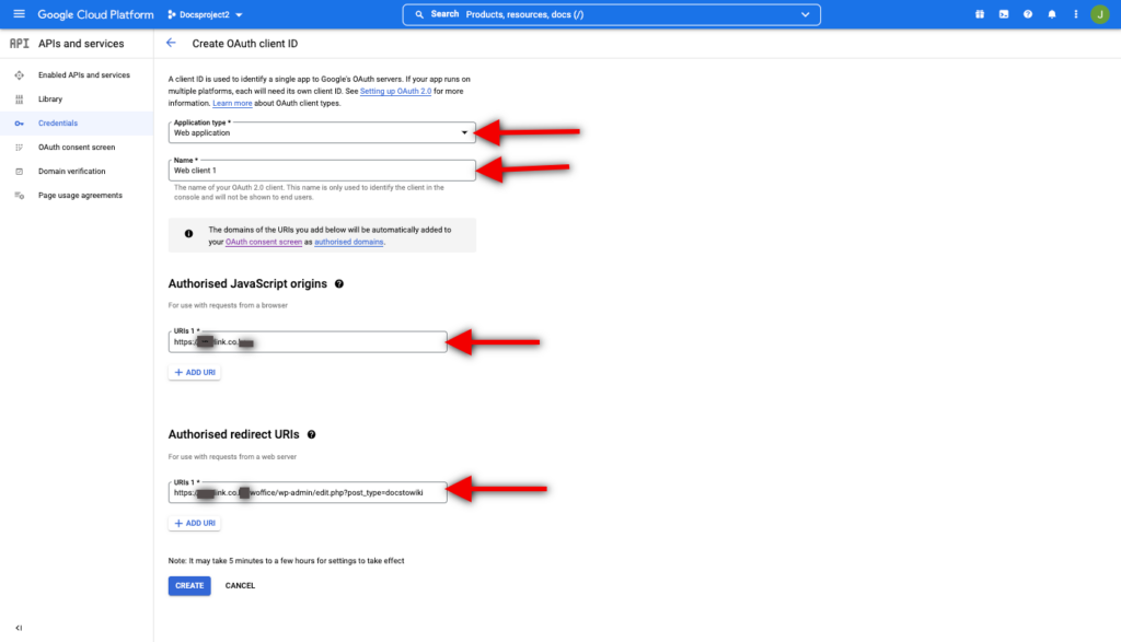 The Authorized redirect URI on the other hand should be your site domain URL with “/wp-admin/edit.php?post_type=docstowiki” appended to it. An example to this is: