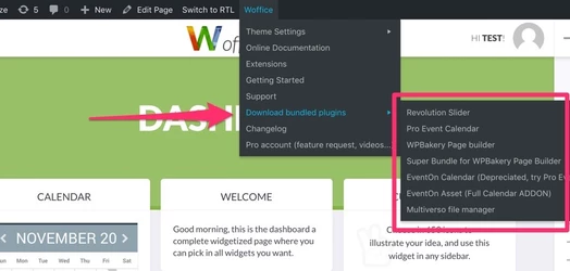 You will see a notice to update the plugin, after updating Woffice in your WordPress dashboard. Otherwise, you can download the plugins from your top Woffice menu, there is a direct link for each and everyone of them: