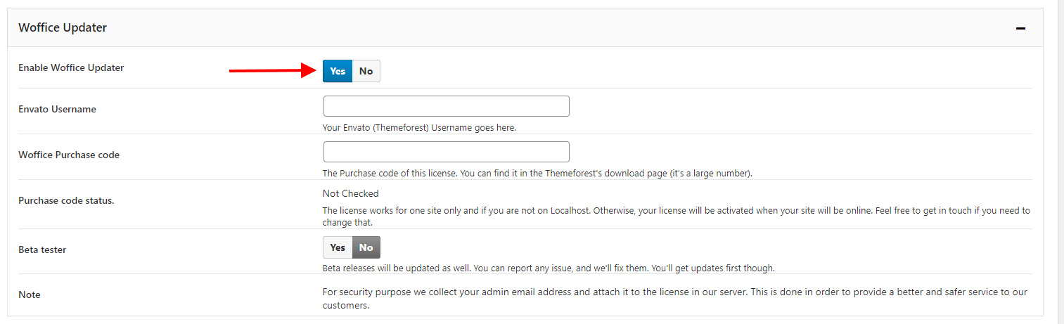 - Navigate to the Appearance > Woffice Theming Options > Theme Extensions > Woffice Updater section within your WordPress dashboard