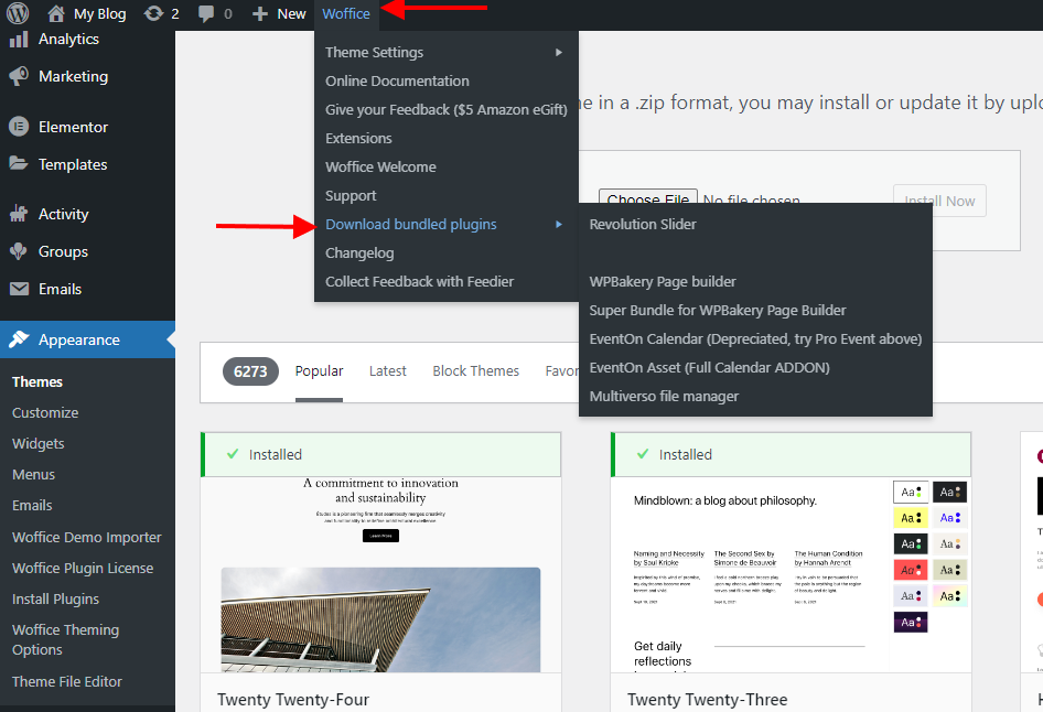 Woffice theme contains various premium plugins bundled into it. These include plugins such as Wp Bakery page builder, Revolution Slider, Super Bundle for WPBakery Page Builder, and EventON plugin and EventOn Asset (Full Calendar ADDON).