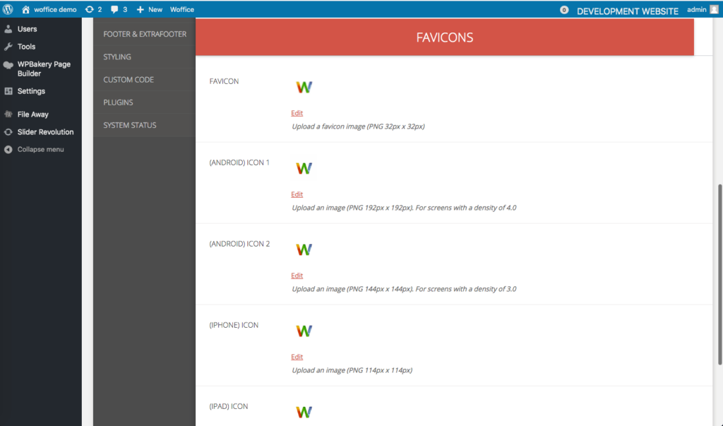 A favicon is also known as a shortcut icon, website icon, tab icon, URL icon, or bookmark icon. Changing your website favicons is accessible through your WordPress Admin Dashboard. Just head to Appearance → Theme Settings → General Options. Scroll down below and you should see the Favicons section. You will see a window just like the one below.