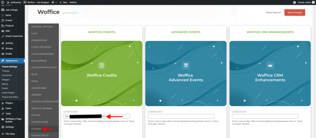 3) Navigate to the Appearance > Theme Settings > Plugins section and within the “WOffice Credits” segment, add your Licence key and save your changes